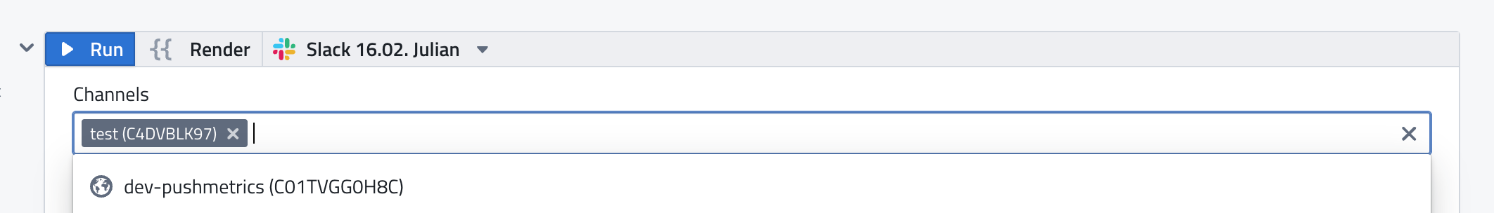 - Private channels where the PushMetrics bot has been invited will appear in the picker.