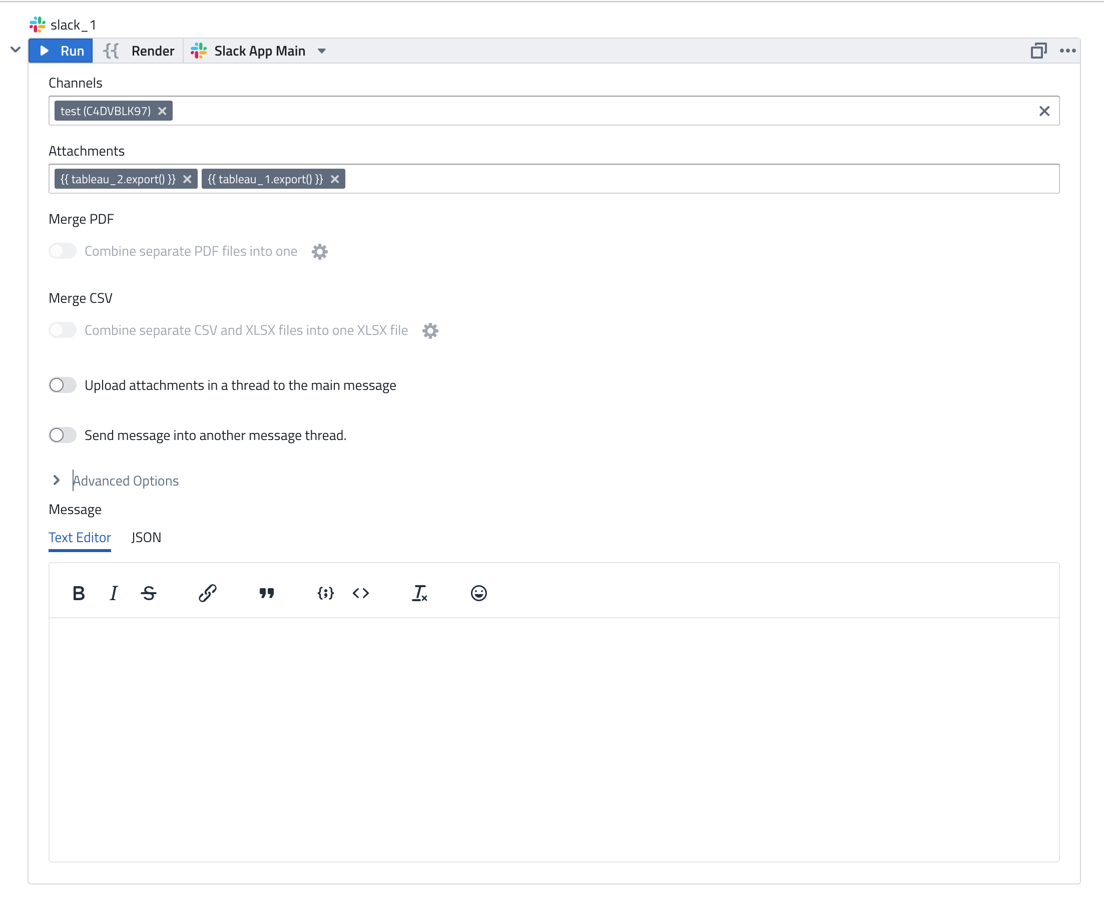 - Attachments: Attachments generated by other tasks that will be uploaded to the Slack channel as files