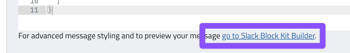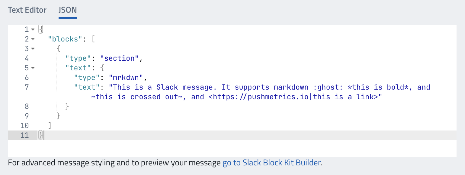 The JSON editor allows you to create more advanced Slack messages using Slack Block Kit UI elements.
