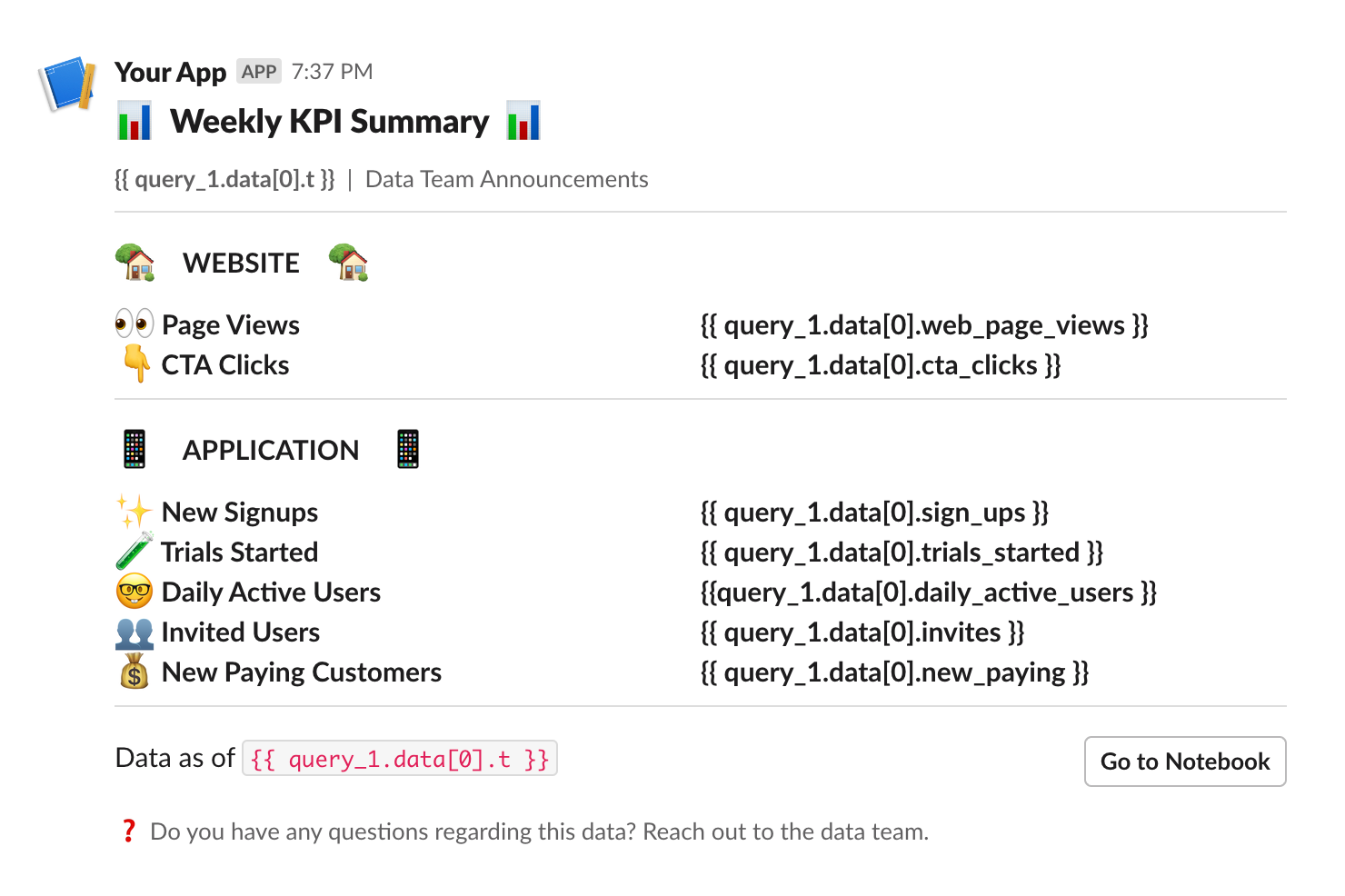 - Alert grouping — send an initial alert, then update the thread with resolution status.
